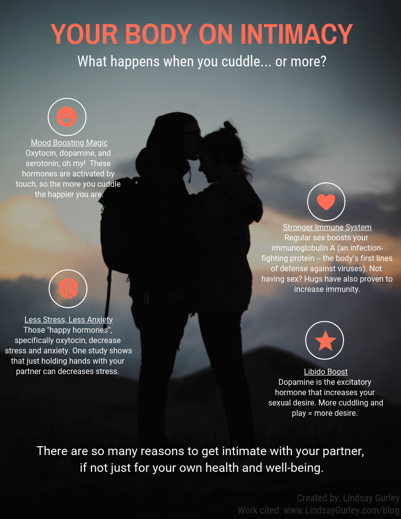 Cuddling, kissing, holding hands, sex, hugging… however you get a dose of intimacy and connection, there is a stream of goodness that pulses through your body.
